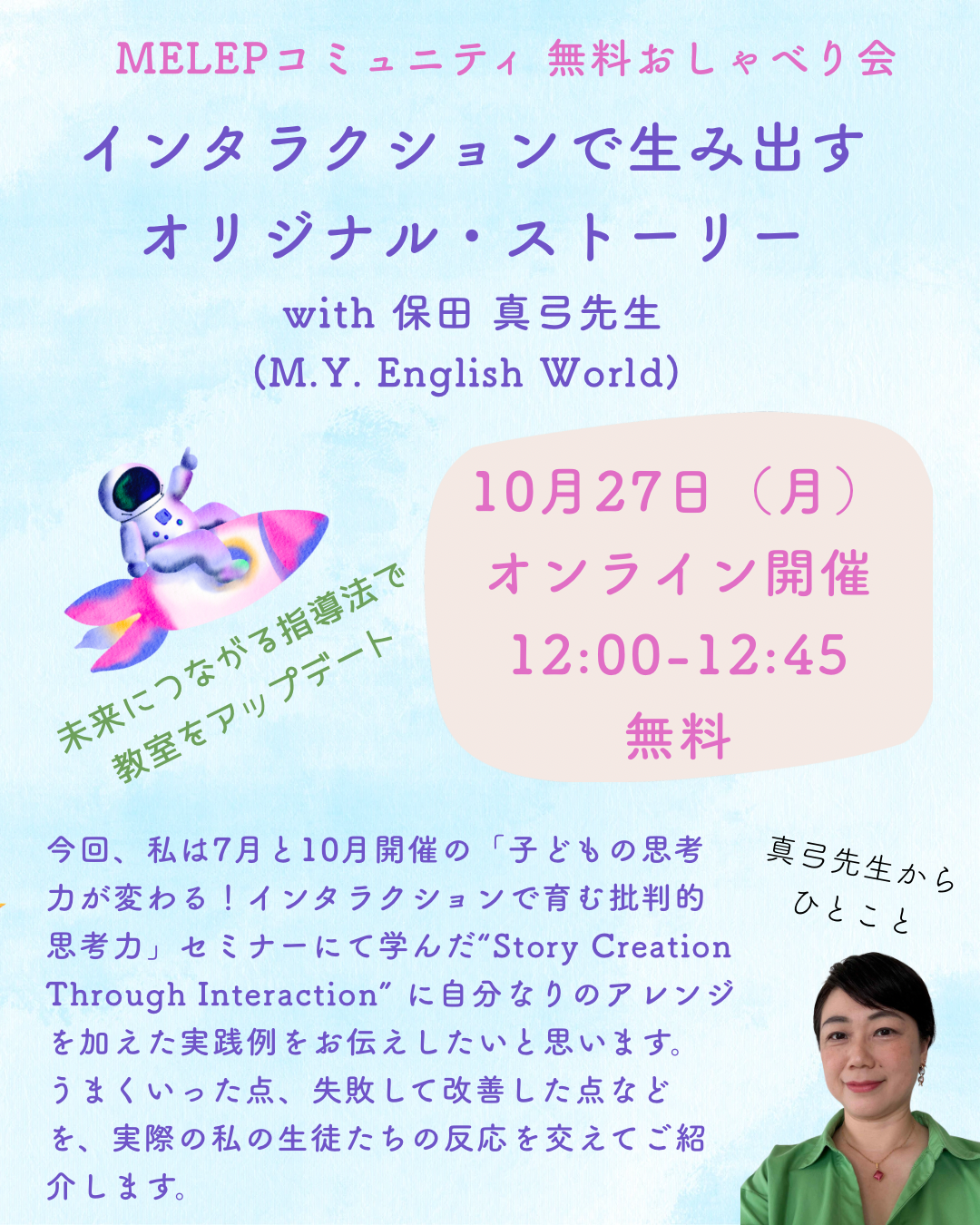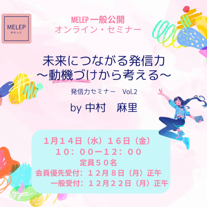 MELEP(麻里英語教育ポート)では グローバル英語教育界を牽引する中村麻里が 確かなリーダーシップと温かいまなざしで 未来志向のこども英語指導者・英語学習者を 応援します